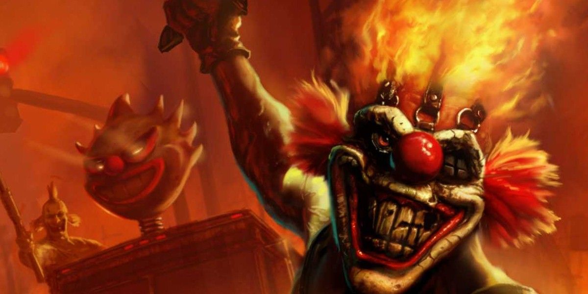 El título del programa llena la imagen, envuelto en humo rosa mientras los cohetes pasan volando. Mackie conduce su automóvil mientras activa sus armas montadas. También se burla Metal retorcidoEl notable psicópata de Sweet Tooth, un payaso asesino cuyo vehículo de elección es un camión de helados.