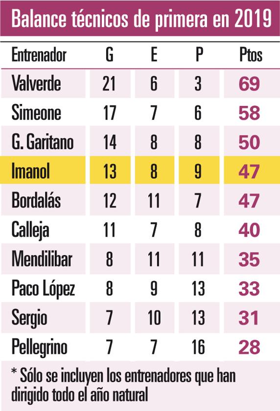 Garitano (50 puntos y 14 partidos ganados) superan los 47 puntos y 13 triunfos cosechados por la Real de Imanol. Bordalás (Getafe), Calleja (Vilarreal), Mendilibar (Eibar), Paco
