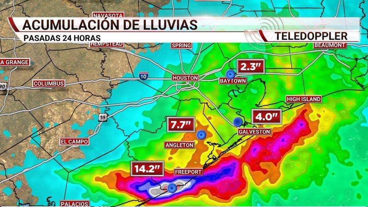 Los condados Matagorda y Brazoria han sido los más afectados con un promedio de entre 4 a 8 pulgadas generalizadas, pero con algunas área que han recibido hasta 19 pulgadas de lluvias.