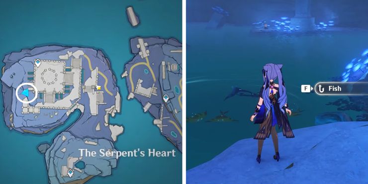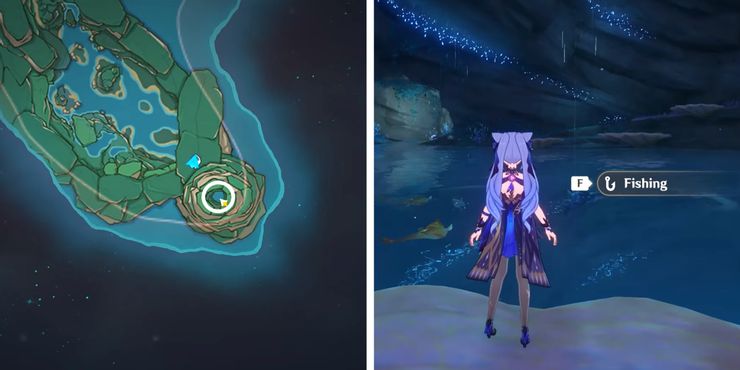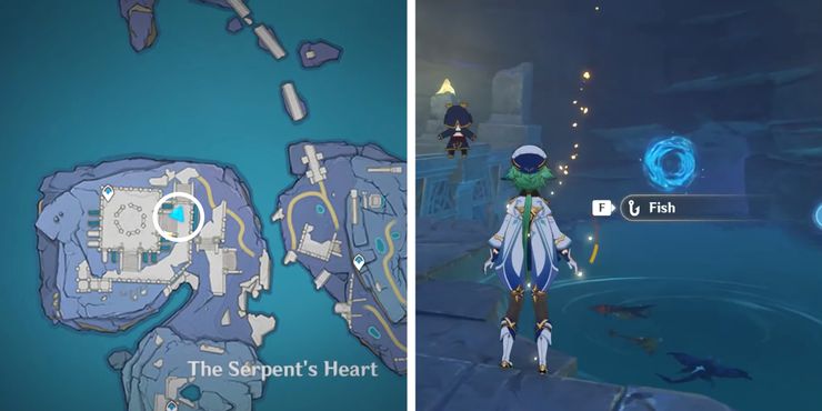 El primer lugar de pesca en Impacto de Genshin Enkanomiya está en el extremo sureste de las entrañas de la serpiente. Desde el Waypoint, los viajeros pueden dirigirse a la entrada de la cueva a la derecha que conduce a una pequeña piscina. Frente a la entrada hay una plataforma donde los jugadores pueden pescar Crystalfish, Lunged Stickleback, Divda Ray y Formalo Ray.