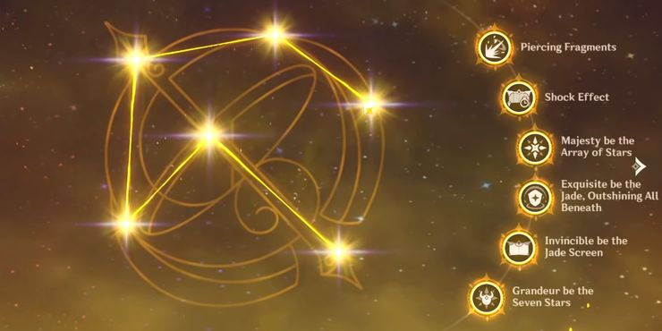 La primera constelación disponible para Ningguang es Piercing Fragments, que otorga daño de área de efecto (AoE) con sus ataques a distancia normales. Aunque esto puede ser útil cuando luchas contra grupos de turbas enemigas menores, los ataques normales de Ningguang no son el uso más efectivo en su equipo. Aún así, Piercing Fragments es una opción confiable, especialmente cuando los jugadores tienen Stella Fortuna adicional. Por otro lado, la próxima Constelación en línea es una de las mejores opciones para actualizar a Ningguang.