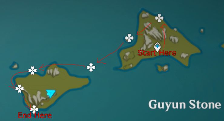 Los tres mapas anteriores se ocupan de las ubicaciones de Starconch en el Bosque de Piedra de Guyun. El camino para esto Impacto Genshin la ruta de cultivo es un poco menos óptima ya que requiere un poco de retroceso, y una ubicación tiene algunos Ruin Guards para atravesar. Sin embargo, nada de esto debería ser particularmente difícil incluso para un grupo por debajo del promedio, y es principalmente una molestia gracias a la necesidad ocasional de caminar por el agua o tomar una ruta tortuosa para llegar al siguiente lugar. Esta ruta debería tomar entre 5 y 10 minutos, según las necesidades del combate y otros factores. Este camino produce 18 Starconch, y también presenta un gran nodo de minería que está etiquetado con un pico como bonificación.