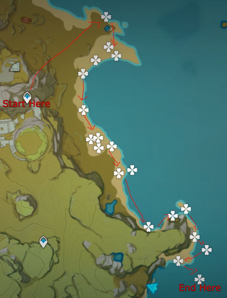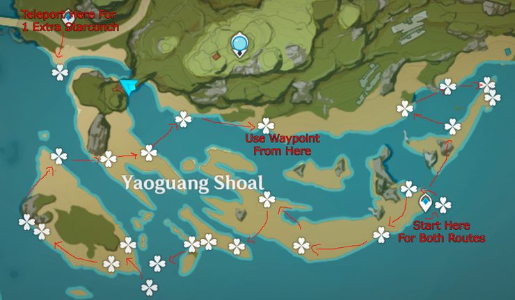 Esta primera ruta se centra en las costas de la playa cerca de dos puntos de referencia en el extremo este de la región de Liyue. No hay nada demasiado sorprendente en este viaje, y es el que tiene la menor cantidad de combates o impedimentos en el camino para adquirir Starconch. Este camino produce 19 Starconch y tarda aproximadamente 5 minutos en completarse, según los enemigos atacados y la familiaridad del jugador con las ubicaciones de cada material.