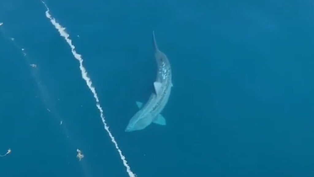El tiburón de tamaño prehistórico fue filmado nadando lentamente junto a un barco lleno de estudiantes de investigación mientras todos gritaban y miraban asombrados.