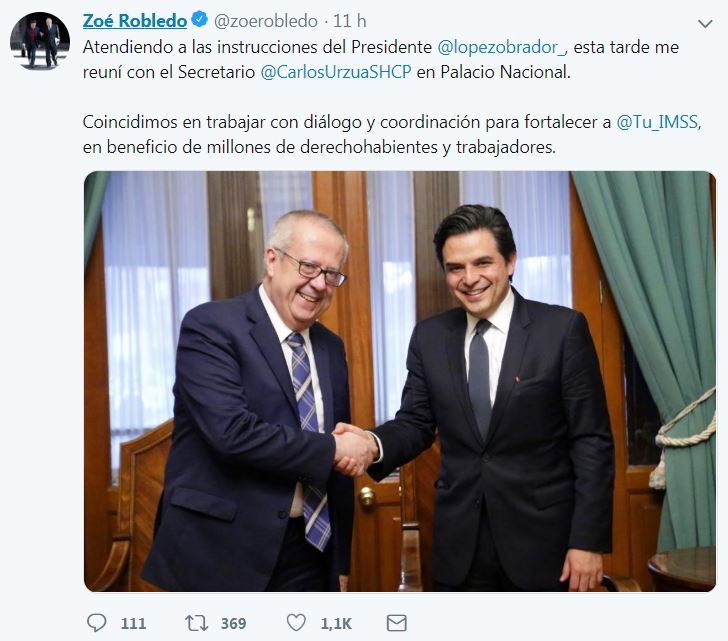 El miércoles en la tarde, Robledo se reunió con el secretario de Hacienda, Carlos Urzúa, para hablar sobre la situación financiera del IMSS.