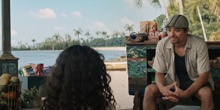 A diferencia del musical, el En las alturas La película implementa un nuevo dispositivo de encuadre en el que Usnavi (Anthony Ramos), presumiblemente del futuro, narra la historia principal a un grupo de niños en una playa lejana. A lo largo de la película, la acción se interrumpe con frecuencia con cortes cortos al lugar tropical de Usnavi, que al final de la película nos enteramos que es en realidad una especie de espejismo, una manifestación de la sueñito – o “pequeño sueño” – eso podría haber sido si el dueño de la bodega, que habla rápido, hubiera llegado a su avión con destino a República Dominicana. Resulta que uno de los niños que ha estado escuchando su historia es la propia hija de Usnavi, Iris, a quien tuvo con Vanessa (Melissa Barrera).