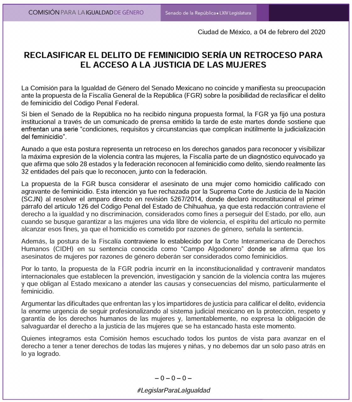 Por su parte, la Comisión para la Igualdad de Género del Senado Mexicano indicó que “no coincide y manifiesta su preocupación ante la propuesta de la Fiscalía General de la República (FGR) sobre la posibilidad de reclasificar el delito de feminicidio del Código Penal Federal”.