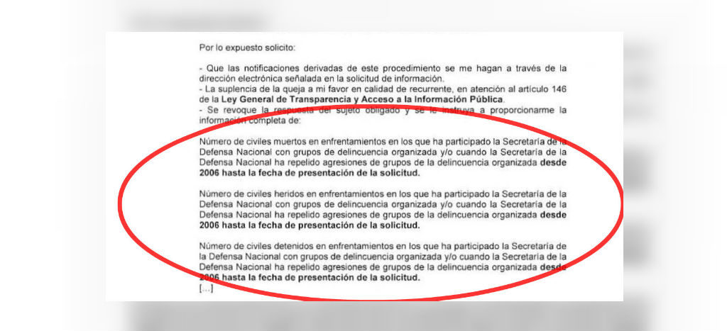 La determinación del Inai es resultado de un recurso de revisión interpuesto por un grupo de académicos y periodistas acompañados por el Programa de Política de Drogas del CIDE y la organización Artículo 19, quienes previamente habían solicitado a la Sedena el número de civiles muertos, heridos y detenidos por su personal desde 2006 hasta la fecha de presentación de la solicitud, el 5 de noviembre de 2018.