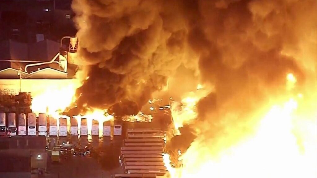 LOS ÁNGELES, CALIFORNIA -Un incendio masivo en un área industrial de Compton envolvió montones de paletas de madera   y se extendió a una fábrica de colchones y varios autobuses en un patio de autobuses adyacente, pero se evitó que se extendiera a un edificio de apartamentos cercano.