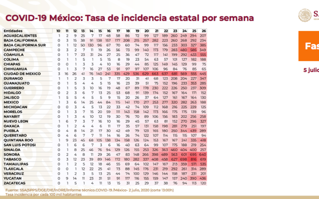 Asimismo, dio a conocer una nueva gráfica con la tasa de incidencia por cada 100 mil habitantes, en la cual Tabasco, Sonora, Tamaulipas, Ciudad de México y Coahuila son las entidades que van en ascenso.