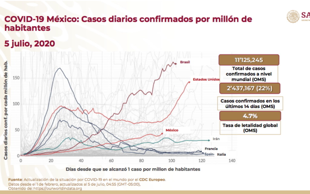 Con base en el portal de datos que compila la Universidad de Oxford en Inglaterra, López-Gatell hizo una comparativa de México respecto a Francia, España, Italia, Irán, Estados Unidos y Brasil.