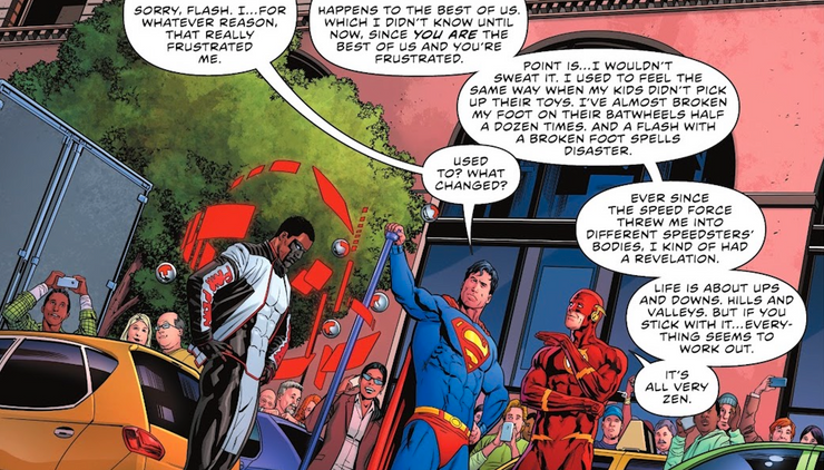 Pero Wally West se apresura a perdonar a Superman y comprende bien el sentimiento, especialmente como padre de niños pequeños. “Solía ​​sentir lo mismo cuando mis hijos no recogían sus juguetes. Casi me rompo el pie con sus Batwheels media docena de veces”. El hecho de que los hijos de Flash, Jai e Iris West, tengan juguetes con temática de Batman dice mucho sobre la popularidad del cruzado con capa en el universo.