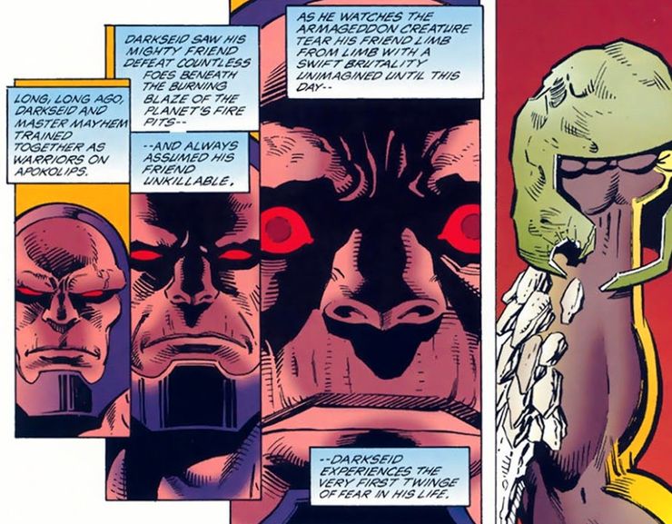 Darkseid tiene varias razones para temer el Día del Juicio Final, pasado o presente. En ese momento, ver a Doomsday matar a Master Mayhem resultó bastante impactante para el gobernante de Apokolips. Nuevos dioses como Mayhem y Darkseid desarrollan habilidades sobrehumanas que los hacen excepcionalmente fuertes y, a veces, aparentemente imposibles de matar. Además de esto, Darkseid notó que Mayhem era un luchador experimentado al que había visto ganar numerosas peleas en las fogatas de Apokolips mientras entrenaban juntos. Ver a Doomsday deshacerse de Mayhem como si no fuera nada le dio a Darkseid motivos para alarmarse.