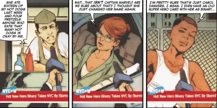 Comprensiblemente, los entrevistados del Universo Marvel creen que Binary es Carol Danvers en su forma más poderosa. Lo cual, teniendo en cuenta que el Capitán Marvel ha adquirido una apariencia ardiente similar antes, no es del todo descabellado. Sin embargo, el público en general confunde a Binary como Danvers, con un hombre que incluso menciona que tiene una vieja tarjeta de superhéroe con ella como Binary, daña la energía que reemplaza al Capitán Marvel. Sin saber qué es, Binary lucha con su identidad y se cuestiona si es Carol o su propio individuo. Con toda la responsabilidad que de repente asumió con la desaparición de Danvers, Binary no ha tenido mucho tiempo para examinar su propia existencia y humanidad. Entonces, escuchar a la gente confundirla con el Capitán Marvel la confunde sobre quién es realmente.