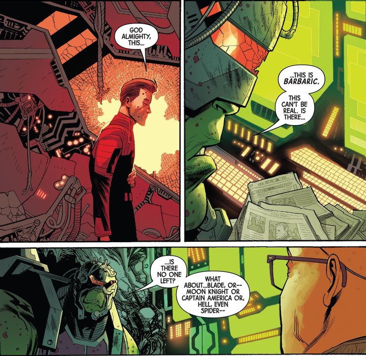 Para sorpresa de Banner principal en el nuevo Hulk #4, prácticamente no hay héroes en esta realidad saturada de rayos gamma. Sin embargo, es interesante saber sobre qué héroes le interesa preguntar a Hulk. Después de enterarse de que Iron Man y los X-Men ya no existen, Banner pregunta sobre otros héroes para ver si todavía pueden estar vivos. Sin embargo, Banner deja a Spider-Man para el final y su fraseo particular parece sugerir que no respeta al Webslinger como un héroe.