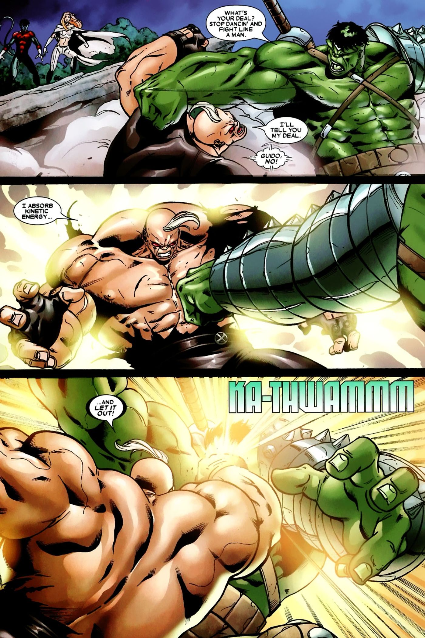 En Hulk de la Guerra Mundial: X-Men #3 por Chris Gage y Andrea Divito, Hulk irrumpió en la X-Mansion en busca de Charles Xavier. El Profesor X es miembro de los Illuminati, y aunque no estuvo presente durante la votación para enviar a Hulk fuera del mundo, le admitió a Hulk que se habría puesto del lado de la mayoría, ya que también cree que Hulk es demasiado peligroso. ser dejado sin control en la Tierra. Entonces, eso fue suficiente para que Hulk justificara el castigo, aunque los X-Men y sus aliados no iban a permitir que eso sucediera. Uno de los mutantes que desafió a Hulk fue Strong Guy, quien absorbió un golpe directo de Hulk y luego canalizó esa energía hacia su propia fuerza, alimentando un ataque que dejó a Hulk momentáneamente aturdido. Hulk le admitió a Strong Guy que sintió ese ataque, lo que convirtió a Strong Guy en un digno oponente para Hulk.