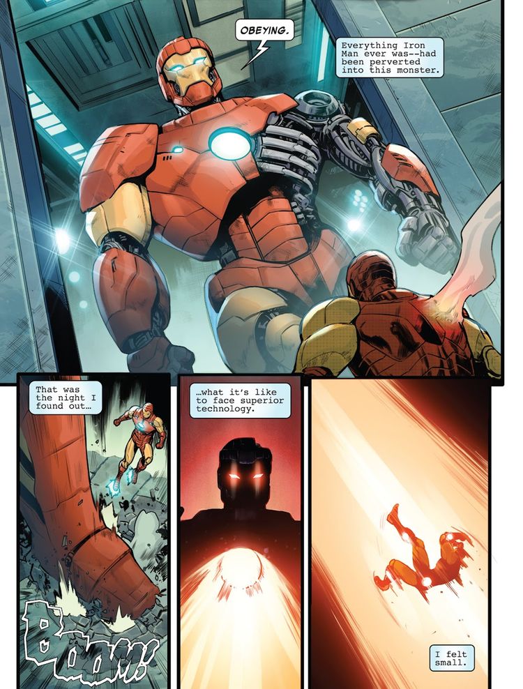 La propiedad intelectual de Stark es sólo una de las varias cosas que Feilong le ha quitado a Tony a lo largo de esta serie. Feilong hizo estallar la casa de piedra rojiza de Tony (matando a uno de sus vecinos), incriminó a James Rhodes por asesinato y fingió el suicidio del principal accionista de Stark Unlimited, Zhong Wei. Después de llenar el aire con Stark Sentinels detectores de mutantes, Feilong añade insulto a la herida con uno construido a imagen de War Machine.