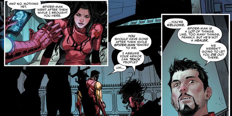 En Temerario # 33 de Chip Zdarsky, Marco Checchetto, Marcio Menyz y Clayton Cowles, Iron Man y Spider-Man vienen al rescate de Daredevil después de que ella está gravemente herida después de una pelea con Bullseye y sus nuevos clones. Cuando se despierta, Tony le informa de lo sucedido, y Elektra se pregunta por qué Iron Man no está en el campo mientras Spider-Man atiende sus heridas. Hilarantemente, Iron Man admite plenamente que Spider-Man es muchas cosas, “demasiadas cosas”, de hecho, pero “no es un sanador”.