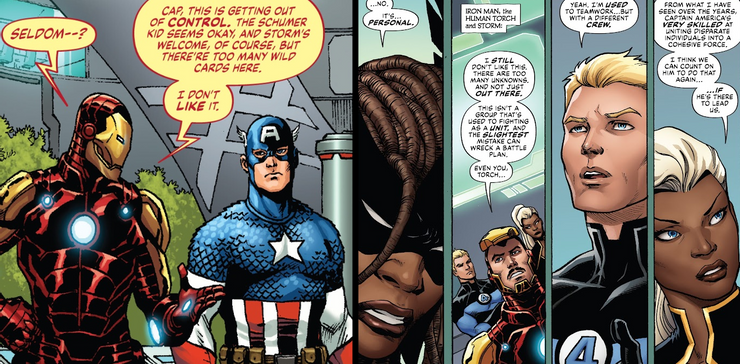 En Maravillas #7 por Kurt Busiek y Yildiray Cinar, Tony Stark da un apasionado discurso sobre cómo está decepcionado por el estado del nuevo equipo ad-hoc que no sabe cómo trabajar en conjunto. El grupo incluye a Black Cat, el nuevo Shi’ar Warbird y el Vision original, pero parece que Tony solo confía realmente en sus compañeros Vengadores y Ororo para no estropear las cosas. “Este no es un grupo que esté acostumbrado a pelear como una unidad”, él dice. “Y el más mínimo error puede arruinar un plan de batalla. Incluso tú, Antorcha…” Al señalar a Human Torch, Stark señala cómo Torch, a diferencia de la mayoría del equipo, ha trabajado en un súper equipo durante la mayor parte de su vida, pero no en los Vengadores. Storm se encuentra exactamente en las mismas situaciones que Human Torch, pero debido a que Stark reconoce su pedigrí, no la llama. De hecho, en una conversación cara a cara con el Capitán América en otro momento de la historia, él la señala como una de las pocas “bienvenidos” adiciones a su unidad.
