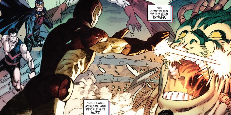 En el número más reciente de la serie, hombre de hierro #18 (con arte de Lan Medina y Colors de Frank D’Armata), se ve a Tony reviviendo sus fracasos más mordaces mientras explica la narrativa temática de la historia de 1886 de Robert Louis Stevenson El extraño caso del Dr Jekyll y Mr Hyde mientras hacía comparaciones puntuales con su propia vida. Mientras realiza este viaje un tanto deprimente por el camino de la memoria, ya habiendo cometido actos monstruosos de violencia dictatorial, Tony recuerda un incidente específico durante el crossover seminal de los Vengadores de 1992. Operación: Tormenta Galáctica. El evento ocurre en Vengadores vol. 1 #347en el clímax del evento de títulos cruzados, en el que Iron Man lidera a un grupo disidente de Vengadores en la ejecución de la Inteligencia Suprema de Kree, un acto que justifica como un final apropiado para un criminal de guerra.