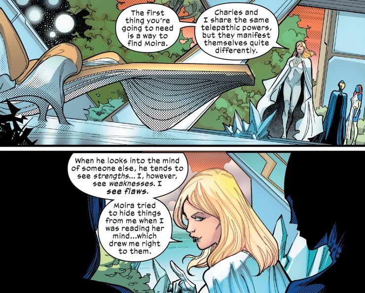 Visto en un flashback, se revela que Emma Frost acordó ayudar a Mystique y Destiny a encontrar a Moira por la única razón de que se había mantenido en la oscuridad sobre la existencia de Moira debido a la desconfianza y el secreto de Magneto y Xavier. Sin embargo, cuando Mystique se encargó de resucitar a Destiny (algo que Moira dijo que no podía suceder), Erik y Charles se desesperaron e intentaron que Emma se uniera a ellos, una oferta que finalmente rechazó con ira. En cambio, Frost usó sus poderes para encontrar a Moira, revelando lo que diferencia sus propias habilidades psíquicas de las de Xavier.