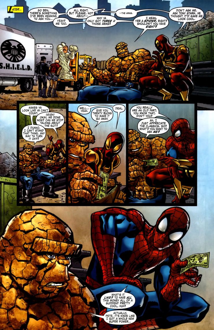 En Dan Slott y Kieron Dwyer’s La cosa # 6 (2006), Spidey se une a Ben Grimm para detener a Sandman y algunos otros enemigos. Después de la batalla rápida, gracias al nuevo disfraz de Iron Spider de Peter, The Thing se queja del regalo de Tony Stark. Ben le dice: “¿Por qué solo tienes tres en esos brazos? Quiero decir, eres una araña, ¿verdad? ¿No deberías tener ocho? Te hace parecer que no puedes contar”. After the Thing le ofrece $ 20 para “Hazlo irse,” Peter (que está constantemente corto de dinero) acepta sin dudarlo. Cuando Peter le pregunta a Ben por qué no favorece el traje de Iron Spider, él responde con la misma mentalidad que muchos fanáticos de Marvel: “Ah, solo aprecio los clásicos.”