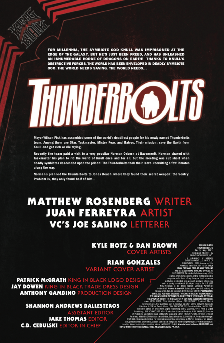 La nueva serie comenzó con Fisk asignando esta tarea a un puñado de villanos, explicando que si tienen éxito y sobreviven a esta empresa casi imposible, les pagará generosamente. La única advertencia es que si alguno de ellos se niega a aceptar esta misión, Fisk los encerrará en una celda de la cárcel donde serían patos fáciles mientras el ejército de simbiontes de Knull consume la tierra. Sin prácticamente ninguna opción, estos Thunderbolts, encabezados por Taskmaster, Star, Mister Fear y Batroc the Leaper, ya han perdido a muchos compañeros de equipo y también han recogido algunos nuevos en el camino.