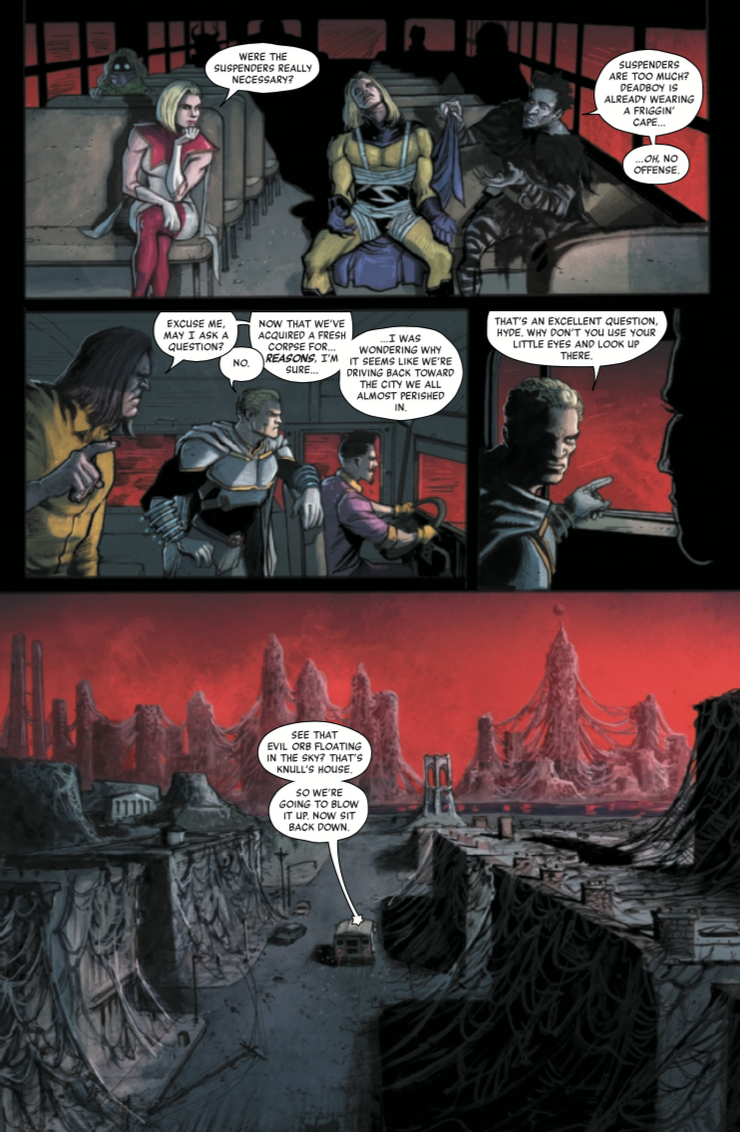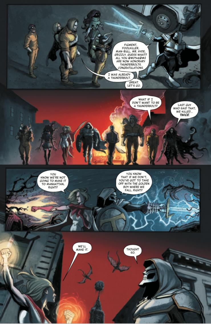 Mientras avanzan a pie por las calles infestadas de simbiontes de Nueva York, un panel muestra al equipo caminando como uno solo. En su camino hacia su destino final culminante, sin saber si alguno de ellos sobrevivirá, este suele ser el momento épico en la mayoría de las historias de superhéroes cuando el equipo finalmente aprende a trabajar juntos como uno solo y derribar al enemigo. Solo que, dado que nadie de este equipo realmente quiere estar allí y con mucho gusto se apuñalarían por la espalda si eso significara su propia supervivencia, esta es una subversión hilarante que se hace aún más divertida porque el Sr.Fear amenaza con matar a Foolkiller por mencionarlo ‘ Prefiero no ser un Thunderbolt.