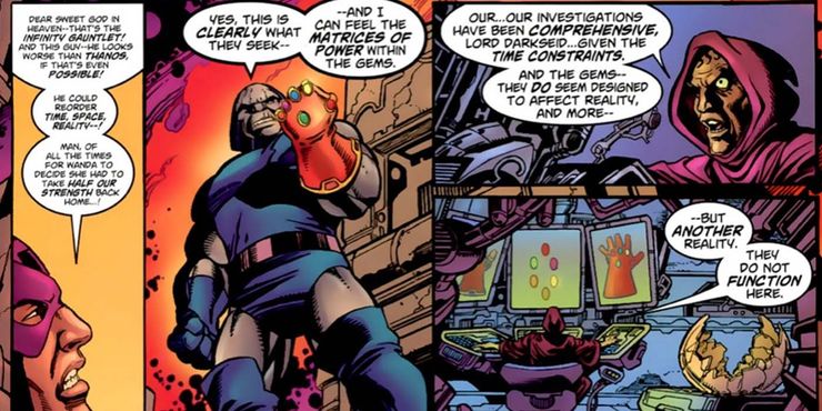 Ver a Darkseid empuñar el Infinity Gauntlet es una de las vistas más aterradoras del crossover cómico, pero, curiosamente, no pudo usar el mayor poder de cambio de realidad de Thanos. Aunque el Infinity Gauntlet era la misma arma cargada con Infinity Gem que Mad Titan usó para reescribir la realidad, en el Universo DC, no pudo funcionar ya que las gemas solo fueron diseñadas para funcionar en el Universo Marvel. Como resultado, Darkseid se deshace del guante con poco cuidado, ya que lo tira a un lado como si nada.