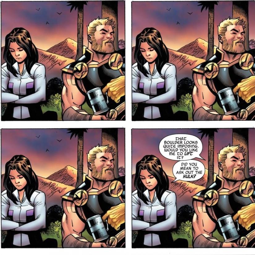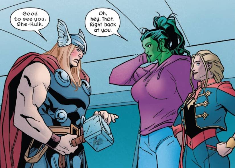 A juzgar por la incomodidad y su sonrojo, She-Hulk y Thor querían pasar este momento lo más rápido posible… tal como lo hizo Marvel con su trama romántica. Dicho esto, es posible que este momento haya sido planeado deliberadamente para insinuar un futuro ángulo amoroso para la pareja.