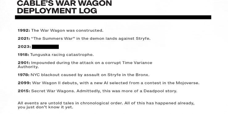 Un extracto de texto que aparece en el libro llamado “Registro de despliegue de vagones de guerra de Cable” rastrea los movimientos del vehículo de Cable, el vagón de guerra. Comienza en 1992, antes de avanzar 29 años hasta 2021, luego dos años más antes de retroceder a 1918 hasta la “catástrofe de carreras de Tunguska” y luego salta casi mil años hasta 2901. Luego vuelve a 1978, a 2099 antes de concluir en 2015. Una nota en la parte inferior llama a estos movimientos “eventos no contados” que ya han sucedido, pero los lectores aún no los conocen.