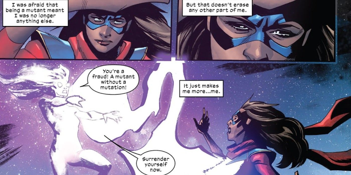 En cambio, líneas como esta se leen como el intento del equipo creativo de asegurar a los lectores que al final del día, no importa cuán menores o importantes hayan sido sus cambios recientes, Kamala Khan sigue siendo Kamala Khan en su esencia. Del mismo modo, sus historias seguirán centrándose en los temas recurrentes, como la identidad, que han dado forma a Kamala desde que se puso por primera vez un disfraz de Ms. Marvel. Mutante o no, Sra. Marvel Todavía se trata de ayudar a las personas y descubrirse a sí misma, y ningún gen X adicional cambiará eso en el corto plazo.