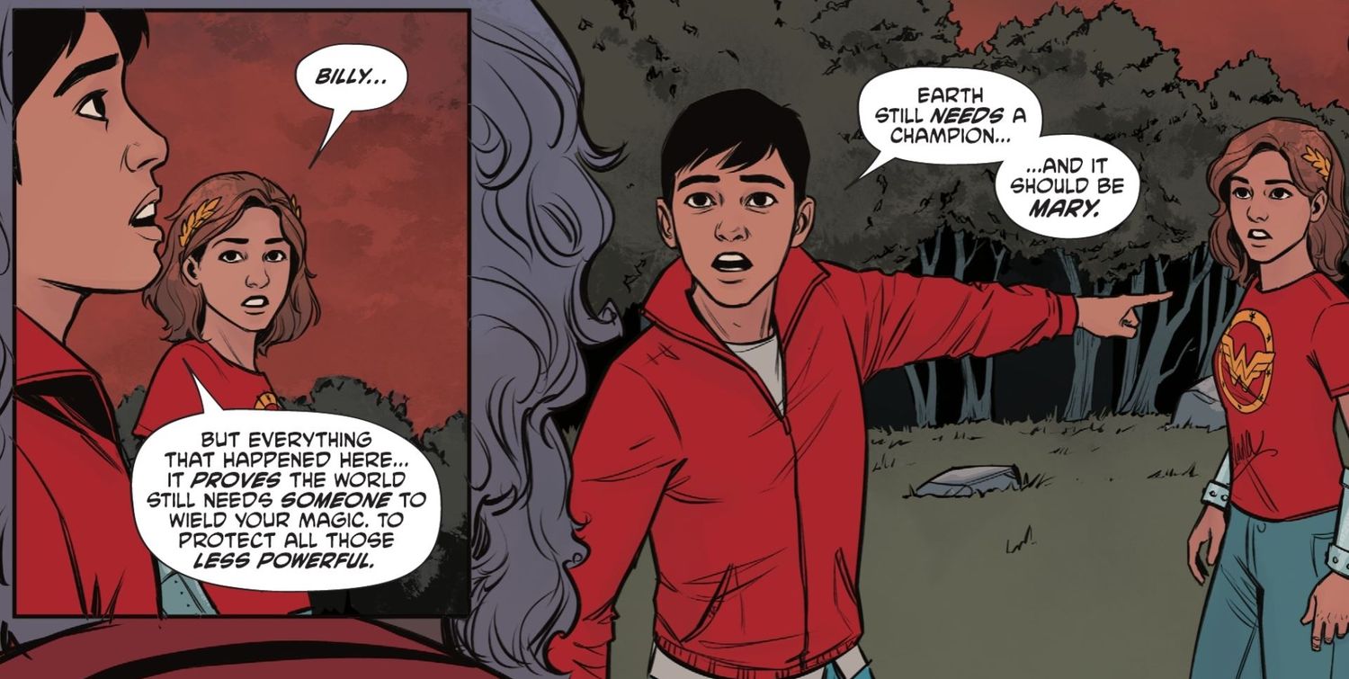 Tanto Mary como el Mago están conmocionados, pero Billy confía en su elección. Billy dice que Mary es más inteligente que él y mucho más experta en usar los poderes de Shazam. Billy confiesa que desde que regresó a la Tierra, siente que ya no encaja y que Mary se ha ganado con creces el derecho de ser la Campeona de la Tierra.