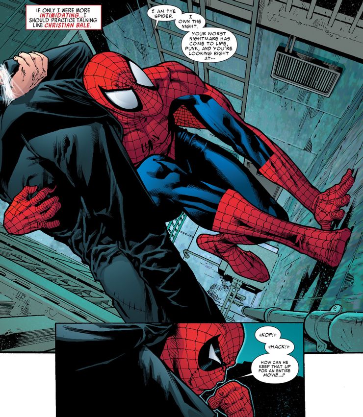 Tiempo Hombre araña confía en su humor y bromas para irritar a sus enemigos y desequilibrarlos, una vez intentó ser más intimidante usando una voz inspirada en la de Christian Bale. hombre murciélago en el Caballero oscuro trilogía. Si bien falla hilarantemente en su primer intento, la broma sirve como una confirmación de que DC Comics y sus héroes existen en el Universo Marvel en un sentido ficticio. Además, el hecho de que Peter Parker debe haberse sentado y observado El caballero oscuro en un momento es bastante divertido.