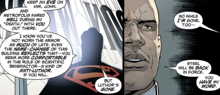 Pero eso no significa que no haya un antagonista mejor y más satisfactorio para Lex; uno que es más adecuado para su conjunto de habilidades en particular. En Superhombre #686 por James Robinson y Renato Guedes, el Hombre de Acero ha partido oficialmente de la Tierra para vivir en Nuevo Krypton con su gente. A medida que la gente de Metrópolis se acostumbra al nuevo statu quo de un Superman ausente, un nuevo héroe ha tomado su lugar: Daxamite y futuro miembro de la Legión de Superhéroes, Mon-El. Con Mon-El todavía aprendiendo, los flashbacks muestran a las personas a las que Clark confió para guiar al joven héroe. Clark habla con su viejo amigo John Henry Irons y lo convence de que regrese a su personaje de Steel mientras Superman está fuera de la Tierra. Pero Clark menciona que John sirve bien como benefactor científico de Metropolis, llegando incluso a llamarlo el “anti-Luthor”.