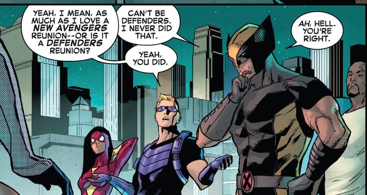 En Tamaño gigante Amazing Spider-Man: King’s Ransom # 1 por Nick Spencer, Rogê Antonio, Carlos Gomez y Zé Carlós, Wolverine es uno de los héroes a los que Spider-Man llama para ayudarlo a acabar con Kingpin. Los otros héroes reunidos incluyen Hawkeye, Luke Cage, Jessica Jones, Spider-Woman y Iron Fist. Muchos de estos héroes eran parte del Nuevos Vengadores lista presentada por primera vez por Brian Michael Bendis y David Finch en 2005, un hecho al que Hawkeye hace referencia directa. Dice que le encanta una reunión de los Nuevos Vengadores “.¿O es una reunión de Defensores?“Wolverine dice,”No pueden ser los Defensores. Nunca hice eso.“Después de que Hawkeye le recuerda que sí, Wolverine FUE en los Defensores, Logan responde”Ah, diablos. Estás bien. “