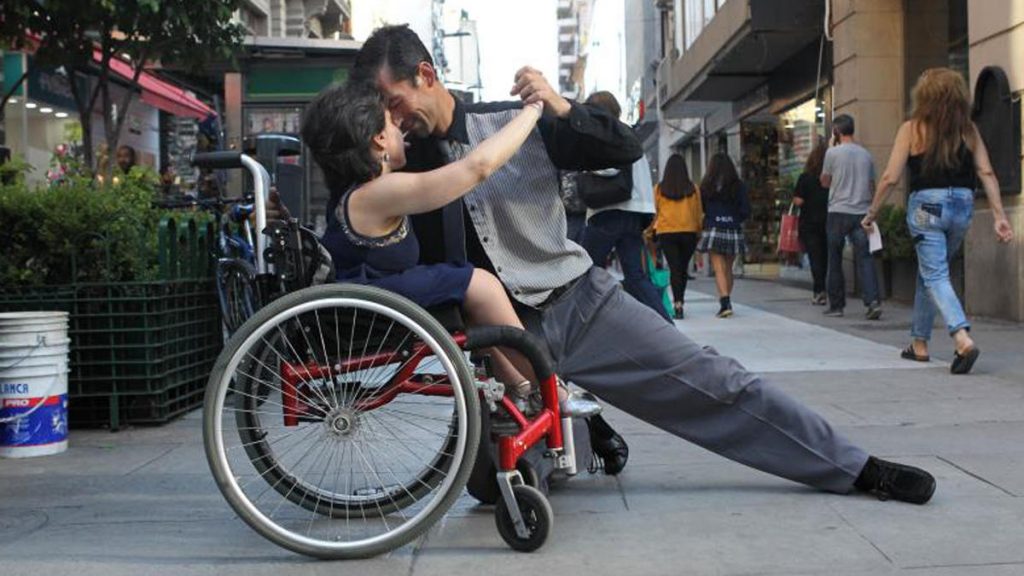 “Con Brenda es un baile que es hermoso, pero también no tiene limitaciones en lo creativo. No tiene limitaciones de nada: de lo que es la expresión de los cuerpos, de lo que es el fluir mientras se baila… al contrario, es mucho mejor”, explica Horacio, que ve una ventaja en que Brenda, su pareja de danza y “de vida” como dicen cariñosamente en sus espectáculos callejeros, baile en una silla de ruedas por su discapacidad.