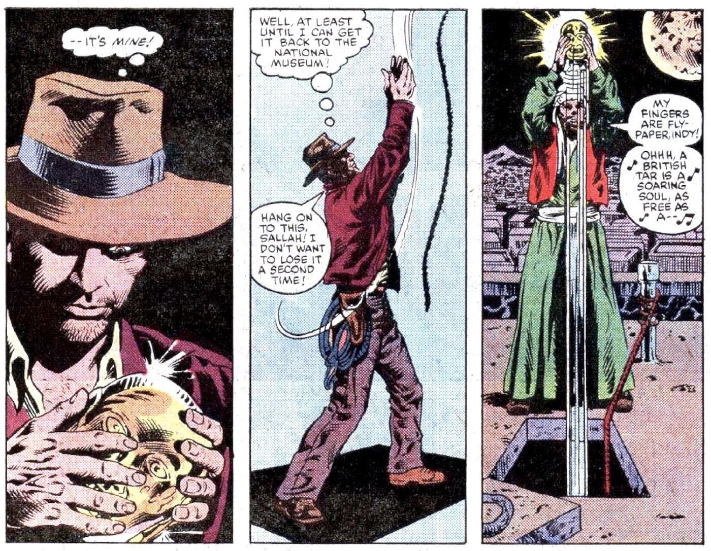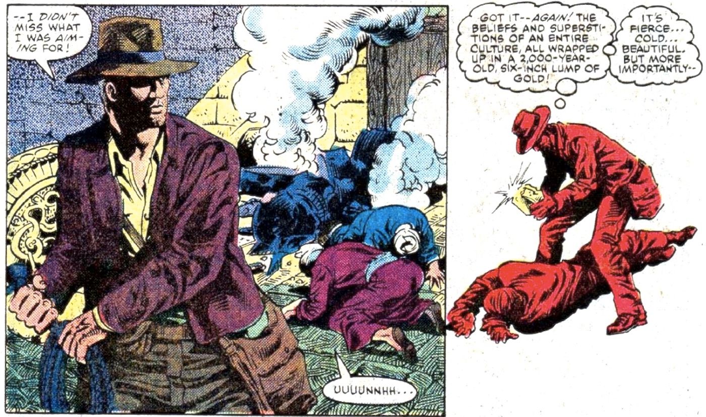 Después del lanzamiento de asaltantesMarvel Comics comenzó a publicar Las nuevas aventuras de Indiana Jones capitalizar el éxito de la película. La serie ve al héroe titular viajando por el mundo recolectando varios elementos de importancia arqueológica, a menudo acompañado por sus aliados en pantalla como Marion Ravenwood, Sallah y Short Round. El arco narrativo “La diosa dorada” de los escritores Archie Goodwin y David Michelinie y el artista Dan Reed tiene lugar en los números 9 y 10 de la serie. Aquí los lectores aprenden que Belloq vendió el ídolo de oro de asaltantes‘ escena de apertura (conocida como el ídolo de la fertilidad Chachapoyan) a un comerciante de antigüedades en Marrakech. Juntos, Indy y Sallah irrumpen y lo recuperan. Sin embargo, una vez que lo obtuvieron y lo trajeron a los Estados Unidos, son perseguidos por el dueño legítimo del ídolo, así como por la hermana de uno de los enemigos más famosos de Indy.