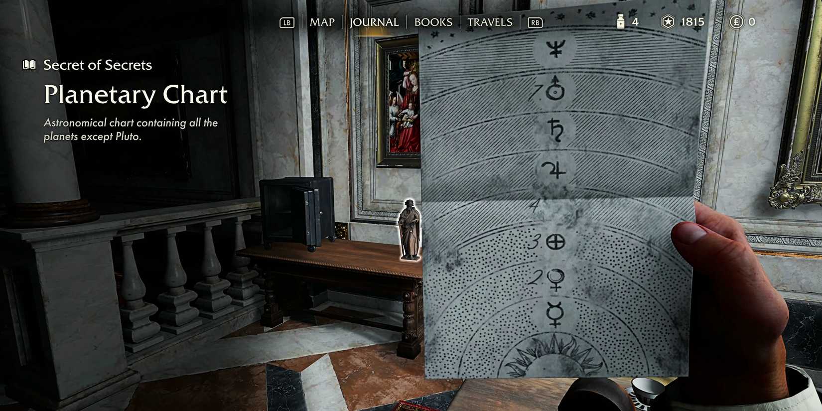 Si conoces bien tus planetas, probablemente ya habrás adivinado la solución a este enigma. En caso de que no lo hagas, regresa al escritorio donde encontraste la nota de Nicoletti y abre el cajón para encontrar una carta planetaria. Este contiene varios de los símbolos que ya hemos visto en otras partes de la sala, por lo que al combinarlos con los símbolos pintados en las estatuas, podemos determinar la combinación.
