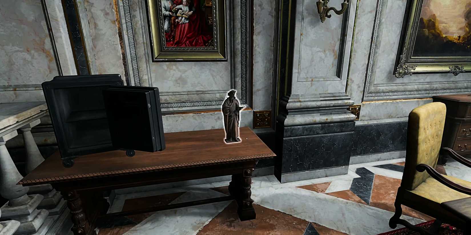 Puede leer la carta de Nicoletti para obtener un poco más de detalles sobre lo que hay en la caja fuerte, pero lo más importante es que querrá prestar especial atención al último párrafo antes de su firma. “Si has vuelto a olvidar la combinación, mira las estrellas y los santos: Pedro con la llave, luego Pablo con la espada..” Esto, por supuesto, suena muy arcano y espiritual, pero tiene un significado relativamente simple: Examinar de cerca las dos estatuas de santos en esta sala en el orden correcto revelará la combinación..