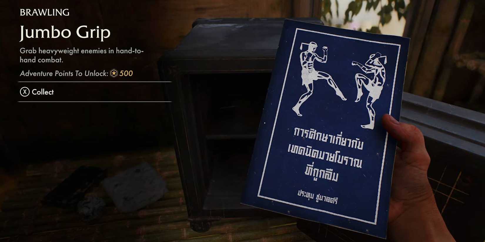 Estos puntos pueden ayudarte a mejorar algunas de tus habilidades, pero la verdadera recompensa proviene de lo que descubres dentro de la caja fuerte de Tongdang Hut. Recibirás el libro de aventuras Jumbo Grip al resolver este misterio.que te brinda una ventaja de combate una vez que lo lees. Cualquiera que lea este libro Puede agarrar enemigos pesados en combate cuerpo a cuerpo..