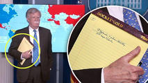 En una ampliación de fotografías tomadas por diversos medios de comunicación durante la rueda de prensa se aprecian dos inscripciones en el cuaderno de Bolton: la primera reza “Afganistán, bienvenidas las negociaciones” de paz con los talibanes, mientras que la segunda dice “5,000 tropas a Colombia”.