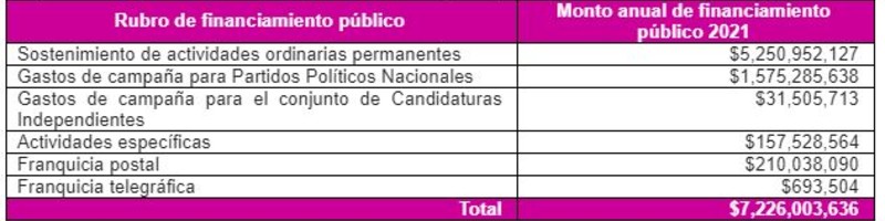 El Consejo General del Instituto Nacional Electoral (INE) informó que el monto total para financiamiento público a los partidos políticos nacionales y candidaturas independientes para 2021 asciende a 7,200 millones de pesos.