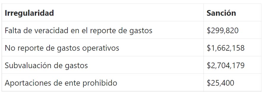 Por lo tanto, se impusieron las siguientes sanciones económicas de acuerdo con las irregularidades cometidas.