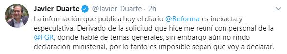 A través de twitter, Duarte aceptó que se reunió con personal de la Fiscalía General de la República, sin embargo, afirmó que no presentó declaración ministerial.
