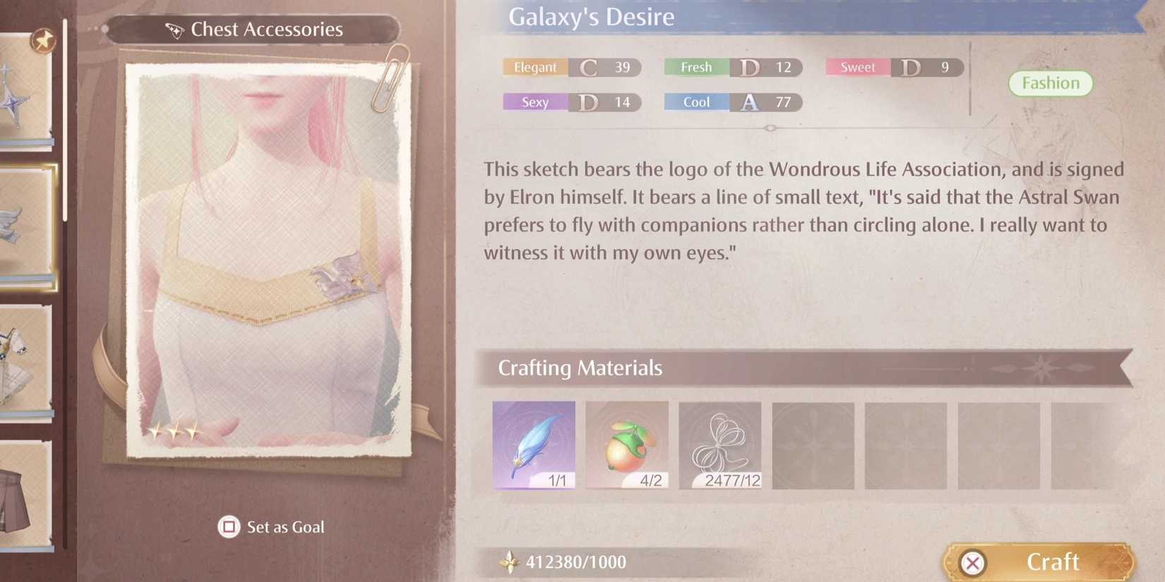 Con Plumas Astrales en mano, los jugadores pueden comenzar a crear prendas de vestir raras que tienen el material necesario para la elaboración de materiales, como el El deseo de la galaxia accesorio para el pecho, Aspiraciones radiantes gargantilla, y el Traje de celebración iluminada por las estrellas. Obtienes el boceto de Galaxy’s Desire inmediatamente después de completar el “Elevándose sobre el cielo estrellado” misión. Sin embargo, los bocetos de Radiant Aspirations y Starlit Celebration solo se pudieron obtener durante el evento Heartfelt Wish por tiempo limitado.