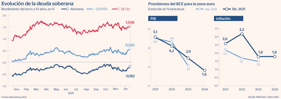 Este mes de diciembre ha sido esclarecedor sobre los pasos de política monetaria que tanto la Reserva Federal (Fed) como el Banco Central Europeo (BCE) tomarán el próximo año para frenar una inflación muy lejos de los objetivos de aumento del 2% anual. La Fed prevé hasta tres subidas de tipos para 2022 tras acelerar la retirada de su programa mensual de estímulos a razón de recortar en 30.000 millones de dólares hasta marzo. Por su parte, Christine Lagarde, presidenta del BCE, elevará su programa de compras ordinario de deuda (APP) a 40.000 millones de euros en el primer trimestre y a 30.000 millones en el segundo. Una forma de contrarrestar –según indican los expertos del servicio de estudios de Bankinter– la supresión desde abril del programa de compra de bonos por emergencia pandémica (PEPP).