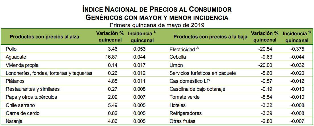 A pesar de que en la primera quincena de mayo de 2019, el Índice Nacional de Precios al Consumidor (INPC) registró un descenso de 0.30 por ciento frente a la quincena anterior, registró una tasa de inflación anual de 4.43 por ciento, con lo que alcanza un nuevo máximo en el año.