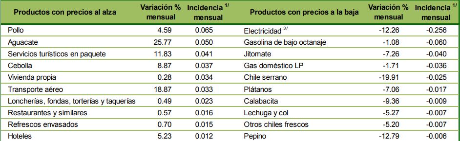 En cambio, los que tuvieron las mayores bajas fueron el chile serrano, el pepino, la electricidad, la calabacita y el jitomate.