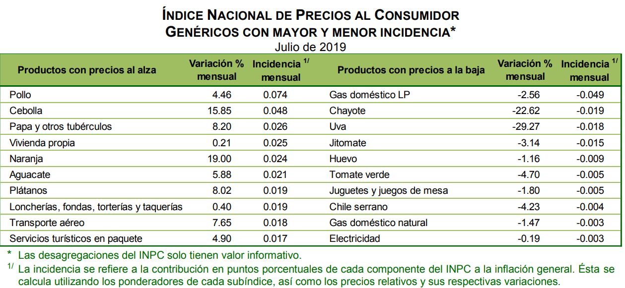 En julio de este año, el Índice Nacional de Precios al Consumidor (INPC) registró un crecimiento mensual de 0.38 por ciento, así como una tasa de inflación anual de 3.78 por ciento, reportó el Instituto Nacional de Estadística y Geografía (Inegi).